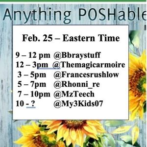 @wandapic56 - here is the flyer for my show. If you put a heart on it, it will notify you when I go live and you can join a show with super nice, super supportive people on Poshmark!