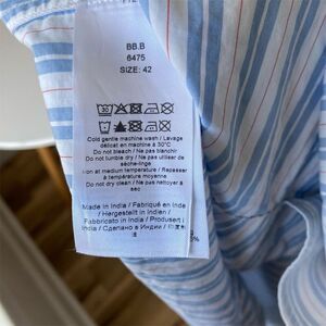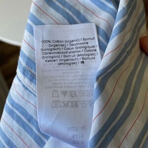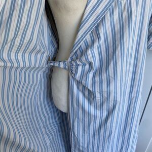 This Ganni midi dress in size 42 features a draped, wrap style with a belted waist and a V-neckline. Made from 100% organic cotton, it is machine washable and crafted in India. The dress is blue with a striped pattern and short sleeves, ideal for casual spring occasions. It is pre-owned and in excellent used condition (EUC).