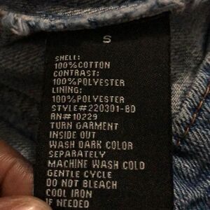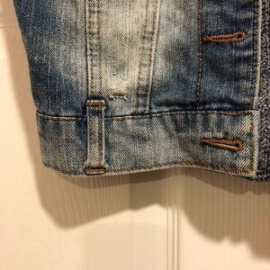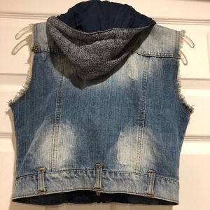 Denim vest with attached hoodie and drawstring. Zip front gives appearance of full hoodie. Distressed look throughout. Frayed on sleeves. Pit to pit 18in, length 17in.