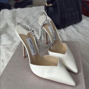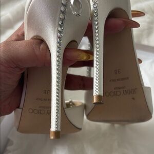 Elegant white heels by Jimmy Choo with stunning embellishments. Perfect for adding a touch of glamour to any outfit. Worn once for my wedding