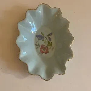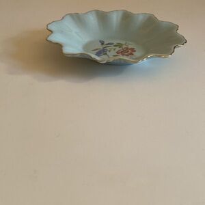 Vintage Trinket / jewelry dish by Adderley . Fine bone China . Delicate light blue w floral design , gold rim . Measures approx 5” x 3.75” . Oval shape w scallop edge detail. . Excellent condition . No chips or cracks. Made in England