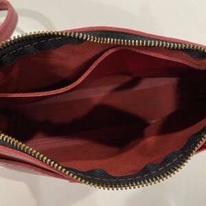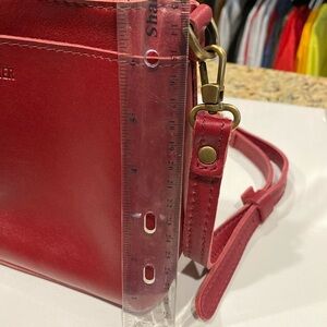 This Portland Leather crossbody bag in a vibrant red color features a smooth leather finish and a stylish rectangular shape. It comes with a long adjustable strap for versatile wear and a gold-toned zipper closure for secure access to your essentials.