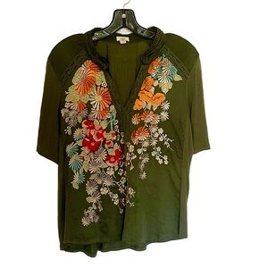 Tiny by Anthropologie M Floral Embroidered Blouse Vibrant Short Sleeve Olive Top