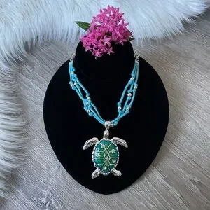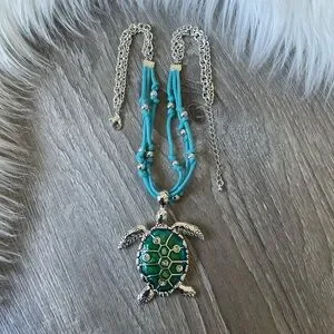 🩵Turtle fun necklace consist of chain, cord and beads with large 2 1/2” turtle pendant.