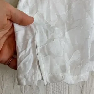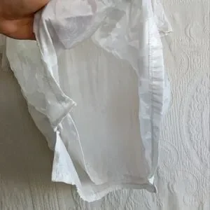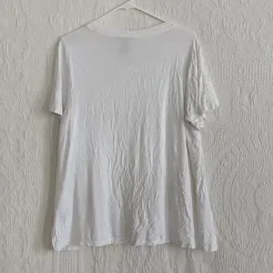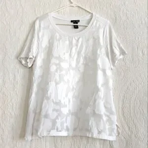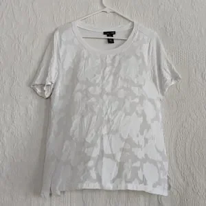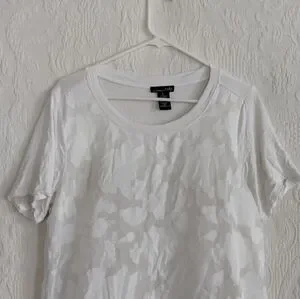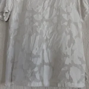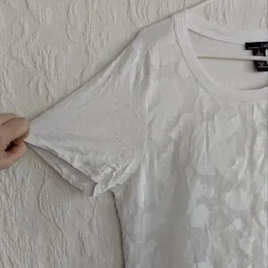 Size large, rxb, sheer White floral t-shirt. This soft and feminine piece is lined with an inner t-shirt and has a slightly three dimensional embroidery to it. The top is in excellent use condition and has no visible flaws. I would note that this is a fairly large large and either would be fairly flowy or could probably be worn on an extra large for a more form-fitting fit.