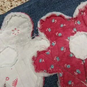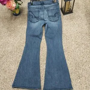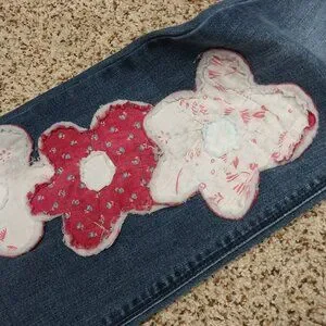 3330 Size 12 American Eagle High-rise Appliqued Quilted Bleach Dyed Jeans. Waist 16.5" inseam 32" rise 10".