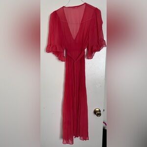 Beautiful Betsey dress, can be worn over a slip or sheer. Ties in the back so can be worn by multiple sizes. Peachy color.