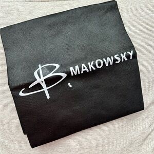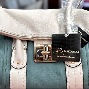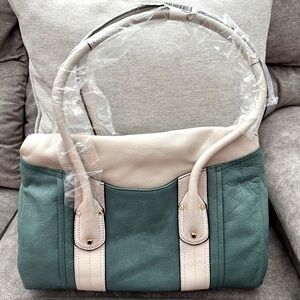 This soft leather handbag is very roomy, with a large interior under the flap, and a separate zippered compartment folds over and closes with a rotating clasp. The purple interior features one zippered pocket and one open pouch. It comes complete with a storage bag.