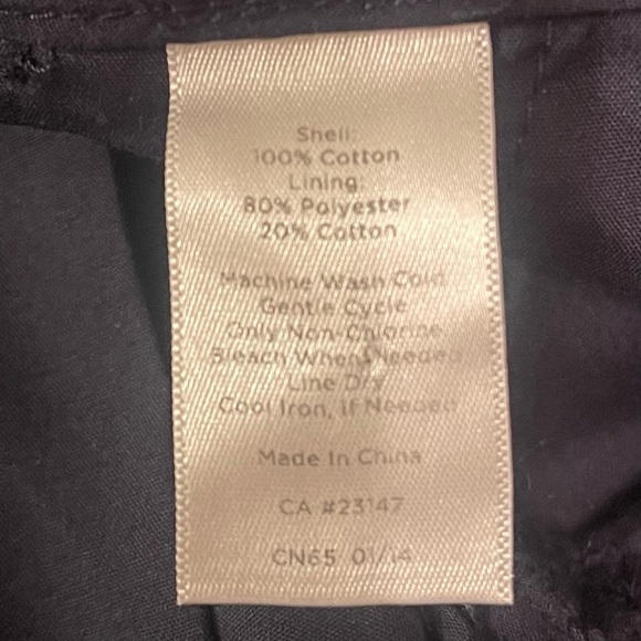 This navy blue pants feature two side pockets, two closed slit pockets on back and a double clasp and button on waist. There is a one and half slit on bottom of back of pants. They are 100% cotton and machine washable and are completely lined. They have recently been dry cleaned. They are a very classic look and can be worn all year round. Measurements are waist 25” and inseam 24 1/2”.