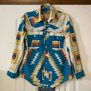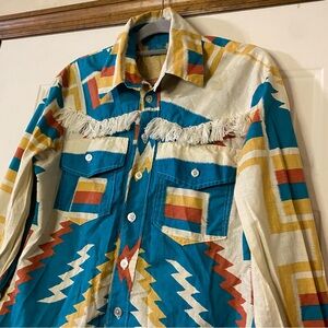 Vintage Mens Large Unisex Southwestern Frayed Tassle Long Sleeve Button Down