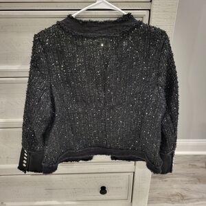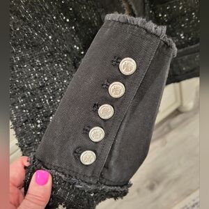 NWT- absolutely gorgeous blazer! Beautiful detail with super pretty lining that sits right at the waist! It has denim detail towards end of arm with nice buttons. This would pair perfect with leather or faux pants or semi- black faded jeans or dress pants!! Doesn't fit, my loss...your gain!
