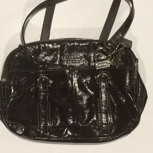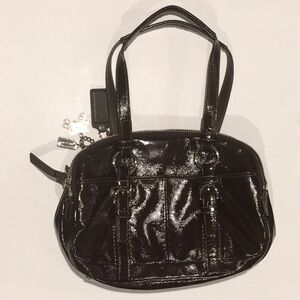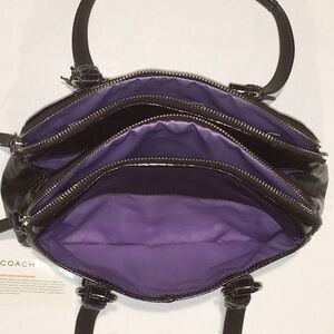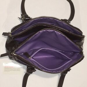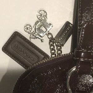 Coach Soho Brown Patent Leather Bag with purple lining, complete with bag charms
