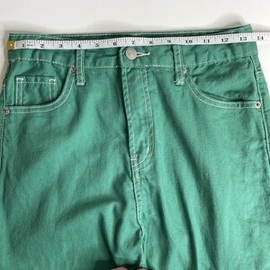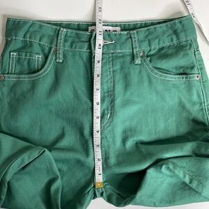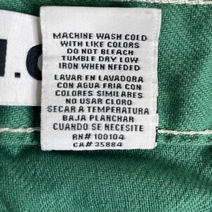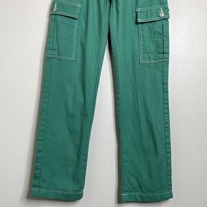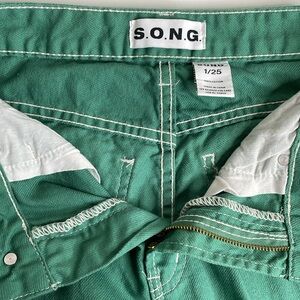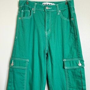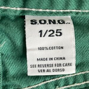 SONG Star of New Generation pants in good used condition with no rips stains or holes but does have some pilling between legs (See pictures). Cargo style with large deep leg pockets, five pockets, wide straight leg, full length, sits on hip, sage green color, white contrast stitching, button and zipper fly, size 1 / 25, high rise, 100% cotton, not stretchy, machine wash. Dog friendly home. Casual, relaxed, young and fun 1990’s style pants great for school and weekend!