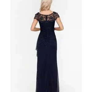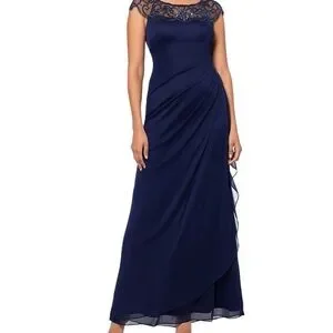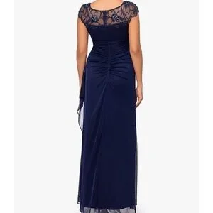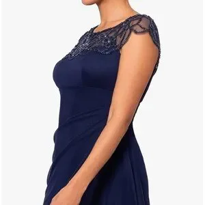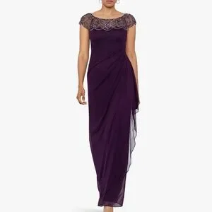 XSCAPE NWT Beaded Cap Sleeve Round Neck Ruched Cascade Ruffle Side Gown (PLUM)