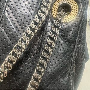 This is an authentic CHANEL Calfskin Perforated Drill Accordion Flap in grey. This spacious flap bag is crafted of grey leather that is perforated across the entire surface. There are cinch style silver chain link shoulder straps with a perforated shoulder pad and protective feet on the base. The flap opens with a textured squared brass and silver Mademoiselle turn lock to a silver fabric interior with zipper and patch pockets.