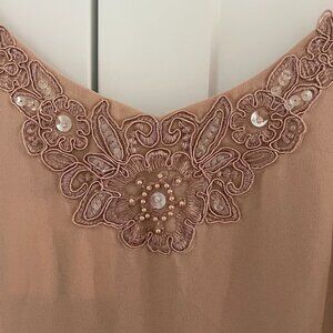 This elegant skin-tone maxi dress features delicate spaghetti straps and a flowing silhouette that moves beautifully with every step. The front is adorned with shimmering silver sequins, adding a touch of glamour while maintaining its graceful, airy feel. Perfect for formal occasions or a chic night out, this dress combines sophistication and effortless charm.