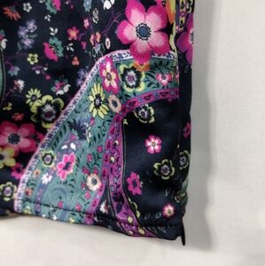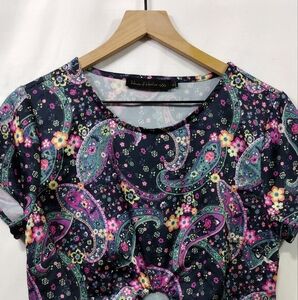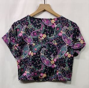 This vibrant floral paisley top is perfect for adding a pop of color to your wardrobe. The intricate design features a blend of pink, blue, and black, making it a versatile choice for any occasion.