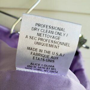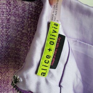 This is for a gently worn Alice and Olivia lavender tweed mini skirt. It is fully lined. Tagged a size 6. Material is 60% Viscose and 40% Cotton on the shell and lining is 100% Polyester. Exposed Gun metal Zipper down the back. Dry Clean only. There is a jacket that matches this (unfortunately I do not have it!).