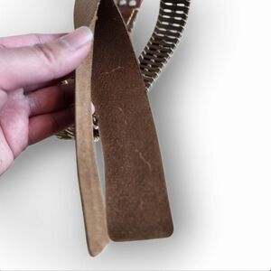 Gorgeous boho western chic belt with a beautiful rustic genuine leather design. The bond on the leather end of the belt came apart (refer back to photos), you might be able to glue it back together, otherwise the rest of the belt is in great used condition. Made in India.