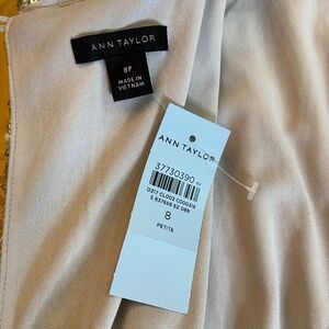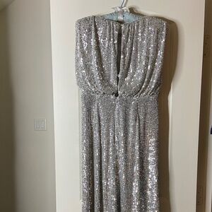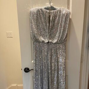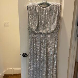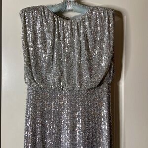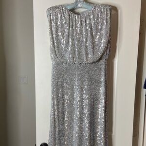 Pretty party dress. Mid-calf length. Slight cap sleeves. Fully lined. Blouson top. Crew neck. High waisted. Slimming style. Skirt is straight, measuring 25 1/2” across the bottom. Measures 15” across waistline, 18” armpit to armpit, 19” at hip. Back neckline to hem is 44”. Hidden zip closure with hook and eye and two buttons. Jersey with some stretch. Fabric is 94% poly and 6% spandex. Lining is 100% poly. Machine washable. Official color is Silver Spark. Original price was $198. I bought this online on sale, not returnable, because I needed a dress for a wedding fast and I loved it, but it didn’t fit. So if you need a dress for a wedding, party, or special event, this may be for you. It’s quite comfortable. No smoking; no pets.