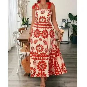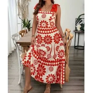 Plus Floral Print Shirred Bodice High Waisted Shoulder Tie Maxi Dress