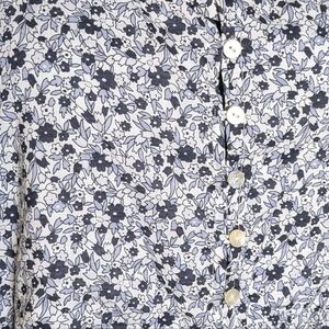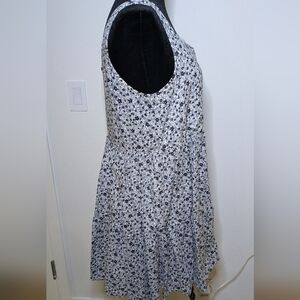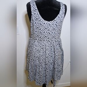 Printed sleeveless mini dress with a relaxed, tiered silhouette. Shell button closures at the bodice