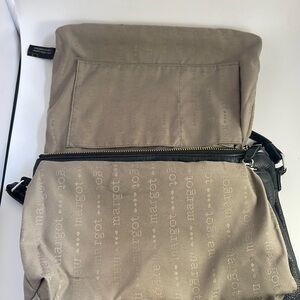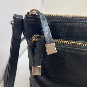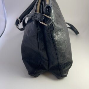 Marked 100% leather. Closure is 2 zippers with an adjustable strap. Style is #2095-BK, Accordian CB. Clean from a non smoking environment. Hardware and strap has wear. Strap has loose threads. Water mark on inside of outside pocket. Please see photos as part of my description.
