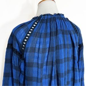 Free People blue plaid long sleeve tie neck peasant top. Notch split keyhole neck with tassel tie, gathered ruched front and back neck, eyelet detail, balloon sleeves with ruffled relaxed elastic bell cuffs. Relaxed but not oversize boxy fit. Blue with navy plaid print and navy eyelets. Textured gauzy woven fabric. Cami with preference-fabric is opaque/not sheer but eyelets show thru around keyhole/lower bust.