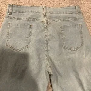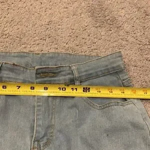Stylish women's light blue jeans featuring elegant white lace detailing on the sides. Perfect for adding a touch of sophistication to your casual wardrobe.