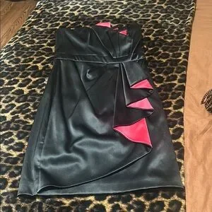 This stunning strapless dress features a sleek black fabric with vibrant hot pink accents. The ruched detailing and cascading ruffles add a touch of elegance, making it perfect for a night out. With a fitted sheath silhouette, this dress is designed to flatter your figure beautifully.