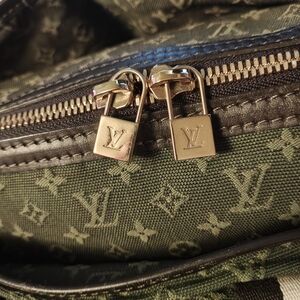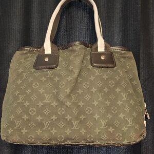 Vintage Louis Vuitton monogram Mini Lin Mary Kate in khaki green. Mini monogram cotton and linen canvas in khaki green. Canvas and leather striped top handles, brass hardware. Exterior flap pocket with leather trim and brass snap. The top opens with a zipper to a fabric interior with slip pocket.