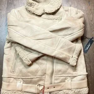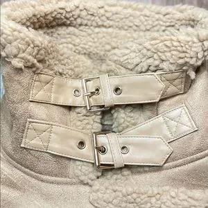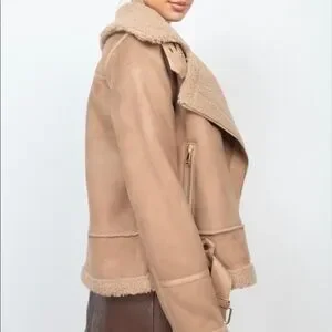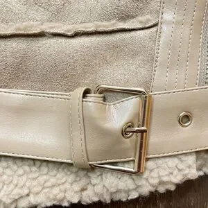 Description: A shearling biker coat featuring faux shearling trim, a front zipper closure, belted waist, buckles at the collar, and side pockets.
