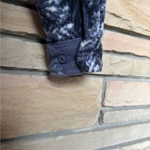 Mountain wear Sherpa lined fleece jacket with horses. Soft and WARM fleece jacket. Has button sleeves and pockets. Super kitschy and rad! Tiny hole (pictured) but is in otherwise perfect condition. The color is somewhere between navy, purple, and gray. Very cozy and perfect for anyone who loves horses!