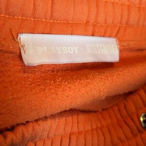 Playboy X Missguided Super Oversized Jumbo Joggers in orange & white in size 8. Elasticized waist with functional black and white drawstring cords. Very oversized fit through legs. Elasticized cuffs. “Playboy” in graffiti print and bunny head going vertically down front left leg. Solid orange rear. Two functional hidden side pockets with functional matching orange zipper tabs. Note: small dark mark on front right leg and light pilling throughout. Inside is soft fleece. Fun pants!