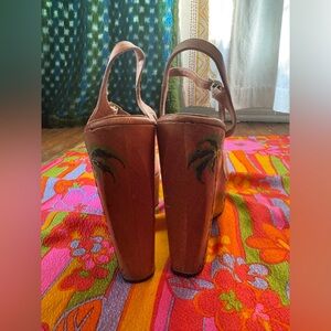 This is a gorgeous pair of 1970s vintage heels made by wonder wedge for Kimel. They are a sky high 5 inch heel with a two inch platform. The heel is wooden with a painting of palm trees and giraffes and the vamp is clear plastic. Disco studio 54 rock and roll vibes! overall in good vintage condition - there are some marks to the leather strap and gouges in the wood - see pics. Marked a size 7.5 but use measurements for best fit as vintage can fit small.