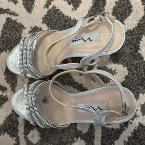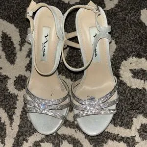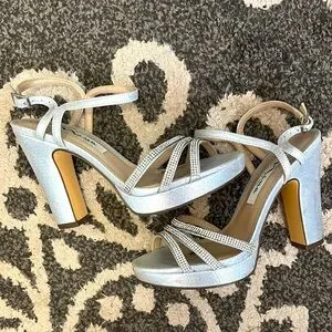 Worn once. From Macy’s. Shows some faint staining on the heels, a tiny bit on the toe area and some glitter is on the sole.