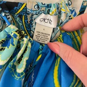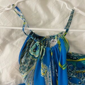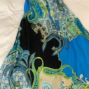 Beautiful eye catching halter dress great for a getaway vacation! Has beading at the top of the dress and some beading on the waistband. Amazing condition! photos don’t do this dress justice. The colors are beautiful!! Size: L and brand: Cache