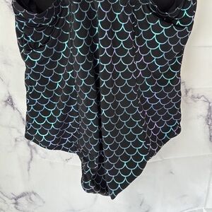Stylish one-piece swimsuit with mermaid scale pattern. Features criss-cross straps. Perfect for beach days by Torrid. It has adjustable straps. Underwire. Medium padding. It is in preowned condition. No visible flaws. It is a size 5X DD/F. Measurements armpit to armpit 18 1/2 inches. Length of bias 37 1/2 inches. Across waist 21 1/2 inches. Hip to hip 25 inches. Measurements are approximate.