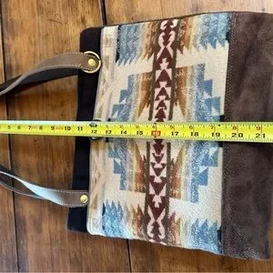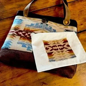 Beautiful Pendleton purse made by Starry Gardens. Only used a handful of times. Comes with its own little removable matching pouch. Three side pockets inside and a roomy tooled leather pocket on the back for your cell phone or small calendar.