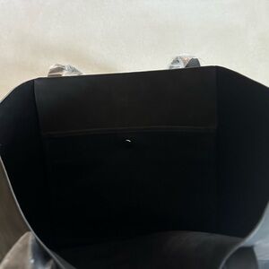 Weathered look black faux suede. Open design that does not have a fastening mechanism to close. Medium size interior pocket with snap closure. RFID Protected card sleeves built in. 9.5" handle drop. Measurements - 15” W x 15” H x 5” D. New with tags.