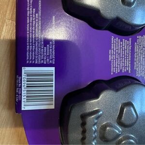 Wilton mini cake pan with skull shapes. Perfect for Halloween treats. Non-stick surface for easy release. Dishwasher safe.