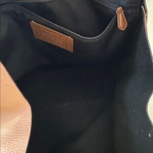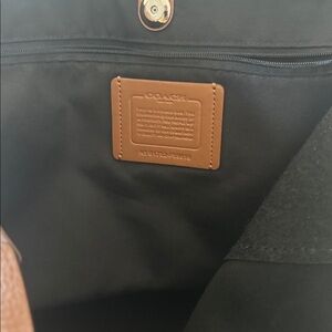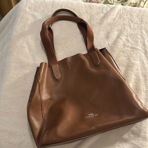 Light brown leather Coach tote bag. Zipper pocket with a snap closure.
