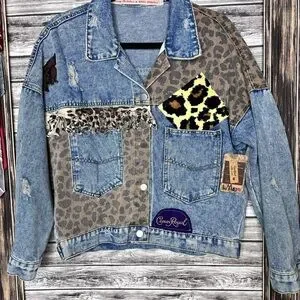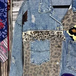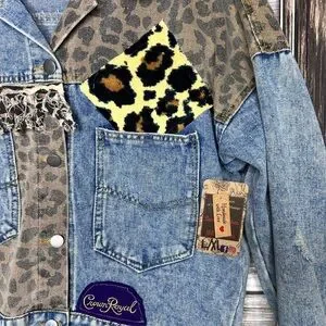 Wild One of A Kind Oversized Leopard Denim Jacket. Two extra large front pockets. Button closure. UpCycled with Black Sequin, Repurposed Crown Royal & Tito’s Bags along with different Repurposed Leopard Fabrics… this is a Head Tuner For Sure!!!! 🔥