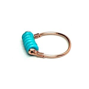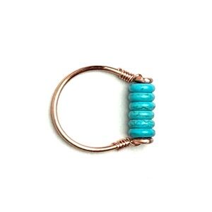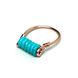 Elegant hand-crafted copper wire line ring with turquoise wagnerite stone beads. The vibrant blue stones are beautifully complemented by the copper band.