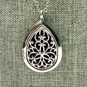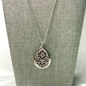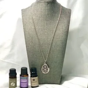 Bring the relaxation of essential oils with you wherever you go with this elegant silver teardrop pendant necklace. Includes three floral essential oils in Lavender, Gardenia, and Honeysuckle. I will also include some diffuser pads.