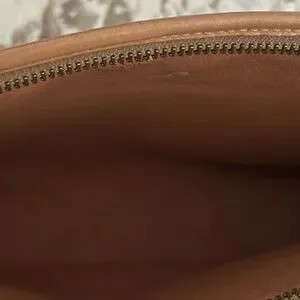 Coated canvas with leather trim, patina on hardware, zipper great condition. Caramel interior lined. Monogram logo exterior.