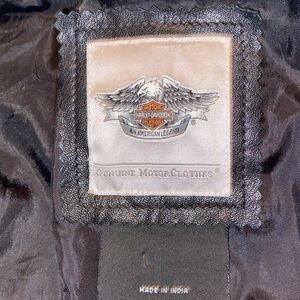 New condition. Size M. Snaps for closures. Breast pockets. 100% goatskin black leather jacket. Fully lined. Pit to pit 20”. Shoulder to shoulder 15”. Sleeves24”. Length 25 1/2”. Harley-Davidson quality & style.