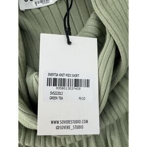This SOVERE Midi Skirt features a striped Glory pattern in Green Tea color with a front slit detail. Made from Nylon and Viscose in Knit fabric, it is a size Medium (M) and has a flowy A-Line silhouette perfect for various occasions like Travel, Wedding, Party/Cocktail, Casual, Formal, Workwear, or Business. Ideal for Summer, Fall, or Spring, this skirt is brand new with tags (NWT) and priced at $149.
