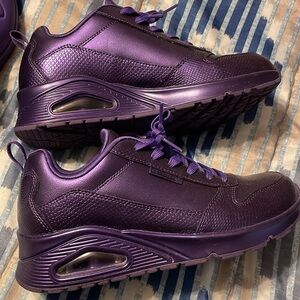 Gently loved pair of purple metallic sneakers from Skechers. Rare find. Dark metallic purple adult women's shoes.