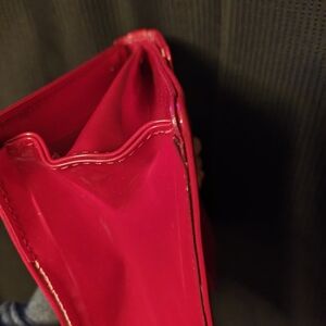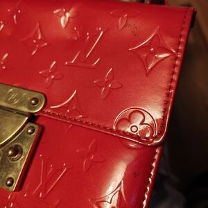 Crafted from signature red monogram vernis patent leather and gold-tone hardware. Featuring a natural leather top handle and a front flap with a logo-engraved press-lock closure. Red leather interior. Key not included.